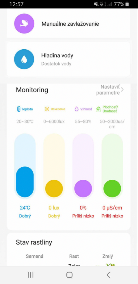 • Sledovať vlhkosť pôdy, teplotu, hladinu vody, intenzitu svetla a stav klíčenia