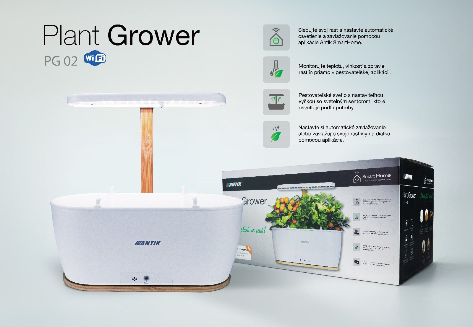 ANTIK Smart kvetináč PG02 ponúka možnosti domáceho pestovania rastlín. Dokáže monitorovať vlhkosť pôdy, okolia a plodnosť rastlín. Taktiež sleduje hladinu vody a prebytočnú vodu je schopný vypustiť do zbernej nádoby. Dokáže monitorovať aj osvetlenie a to všetko za pomoci 5 senzorov, ktoré ukladajú dáta za obdobie posledných 3 mesiacov. Konektivita je zabezpečená technológiou Wi-Fi na frekvencii 2,4 GHz. Kvetináč komunikuje prostredníctvom mobilnej aplikácie ANTIK SmartHome® vhodnej pre operačné systémy Android aj iOS. Pracovná teplota je v rozmedzí -20 až +50 °C. O zavlažovanie sa stará 2 litrový zásobník na vodu.