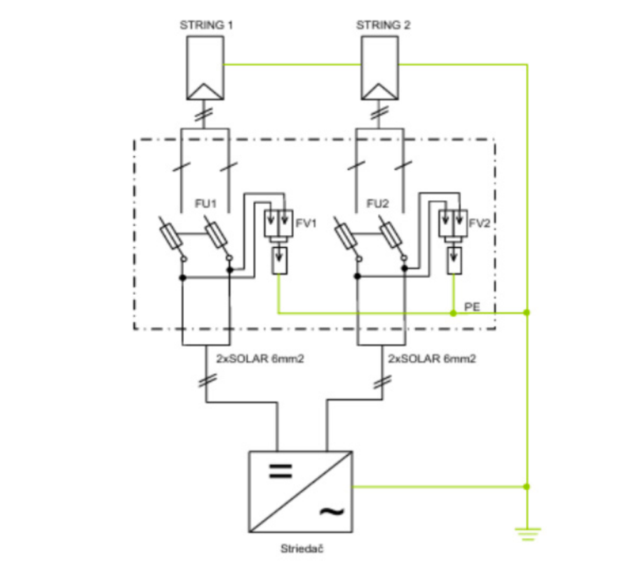 Z každého stringu následne vedú výstupné vodiče 2×SOLAR 6 mm² do striedača, kde sa jednosmerný prúd premieňa na striedavý. Toto zapojenie zaisťuje nezávislú a spoľahlivú ochranu pre oba stringy a prispieva k dlhodobej stabilite celého fotovoltického systému.
