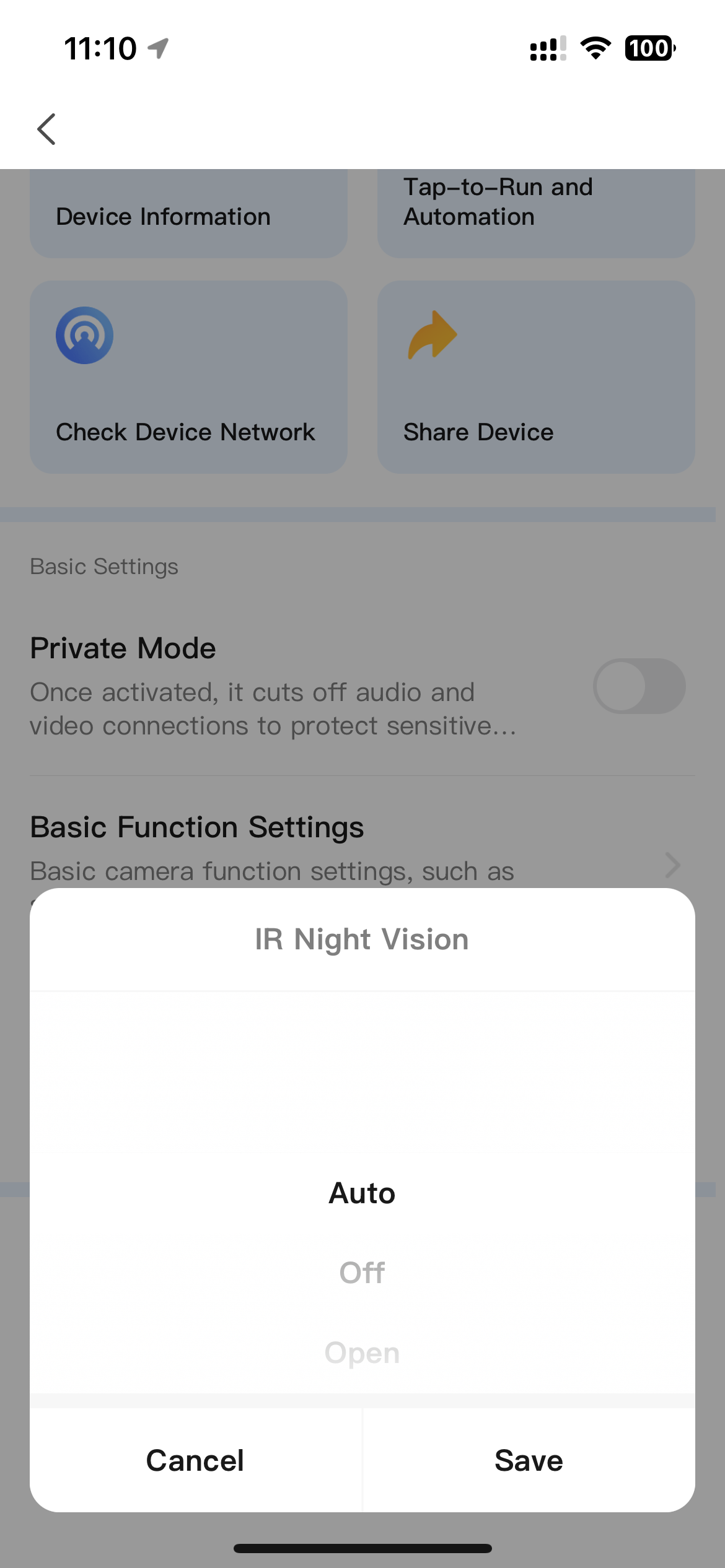 • Open: Trvalé zapnutie IR pre nepretržité čiernobiele zobrazenie.
