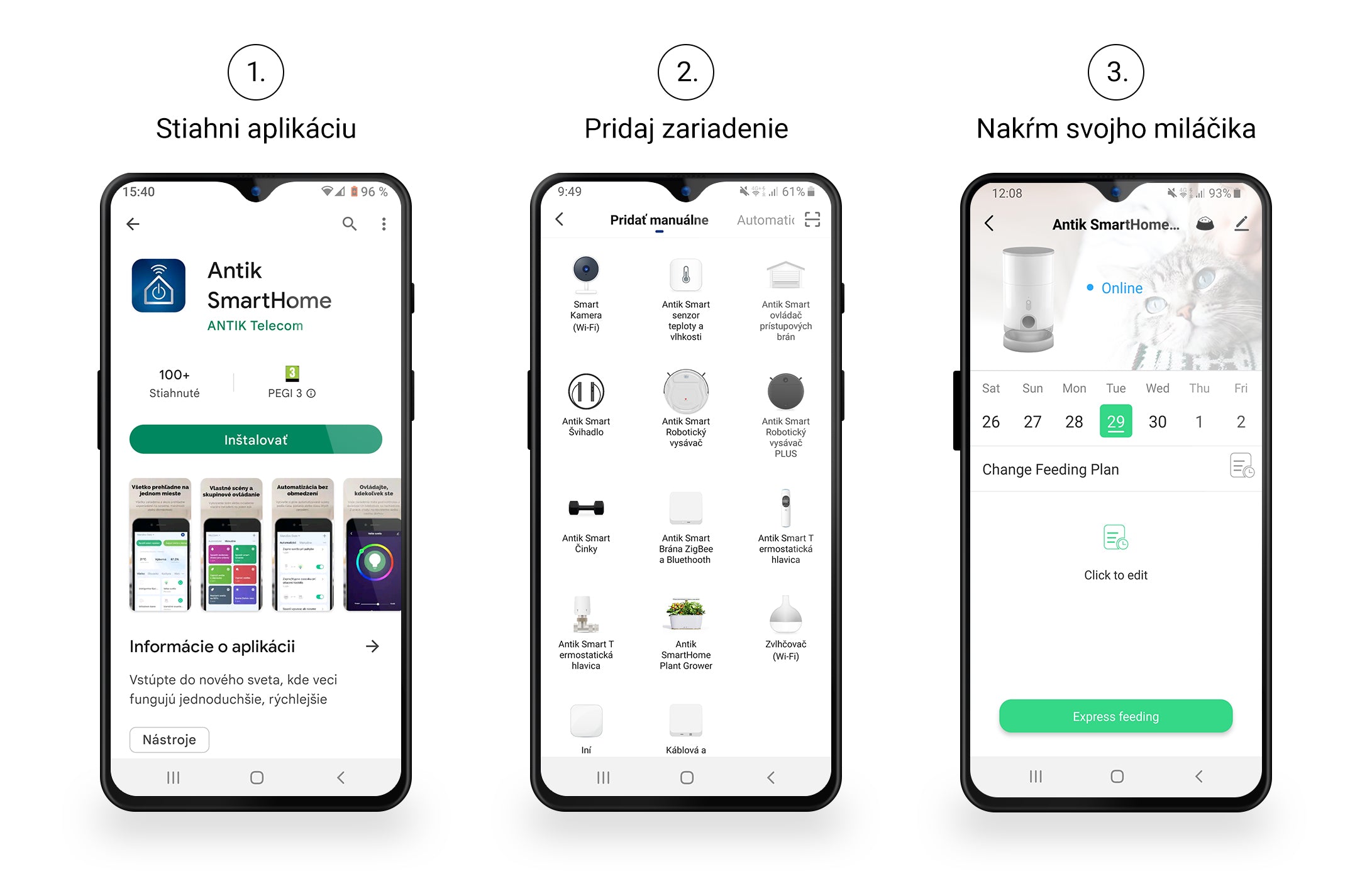 ANTIK SmartHome dávkovač potravy umožňuje naprogramovať plán kŕmenia vášho domáceho maznáčika prostredníctvom mobilnej aplikácie Antik SmartHome®. Môžete nastaviť čas, počet porcií a veľkosť porcie, čím zabezpečíte, že váš domáci miláčik dostane jedlo vždy načas, aj keď nie ste doma.
