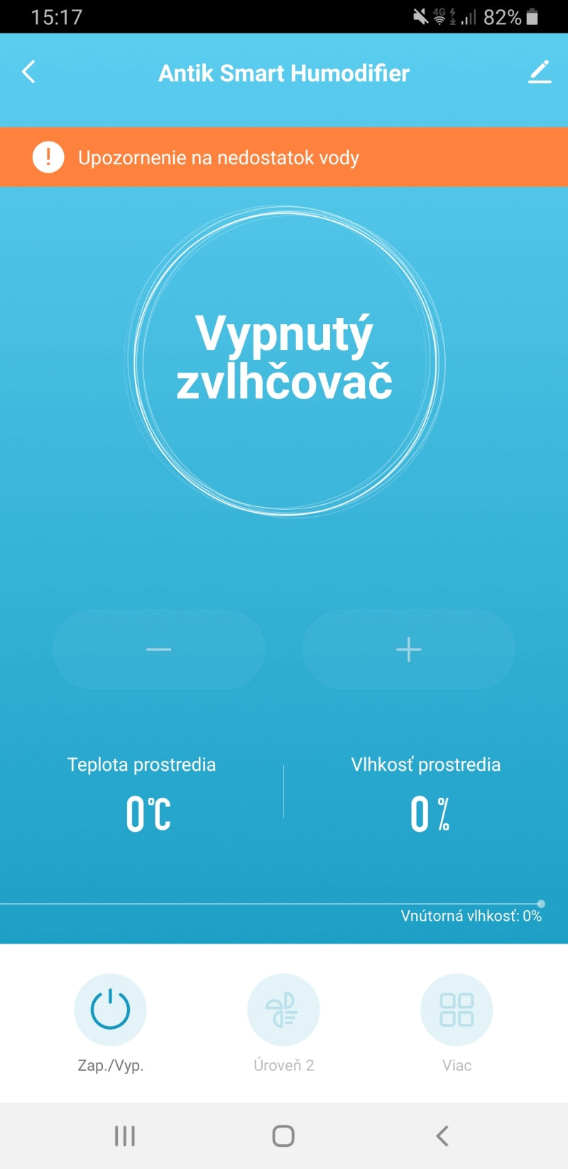 Zariadenie automaticky zastaví prevádzku a zobrazí upozornenie o nedostatku vody, aby sa predišlo poškodeniu. Po doplnení vody možno zvlhčovanie okamžite obnoviť.