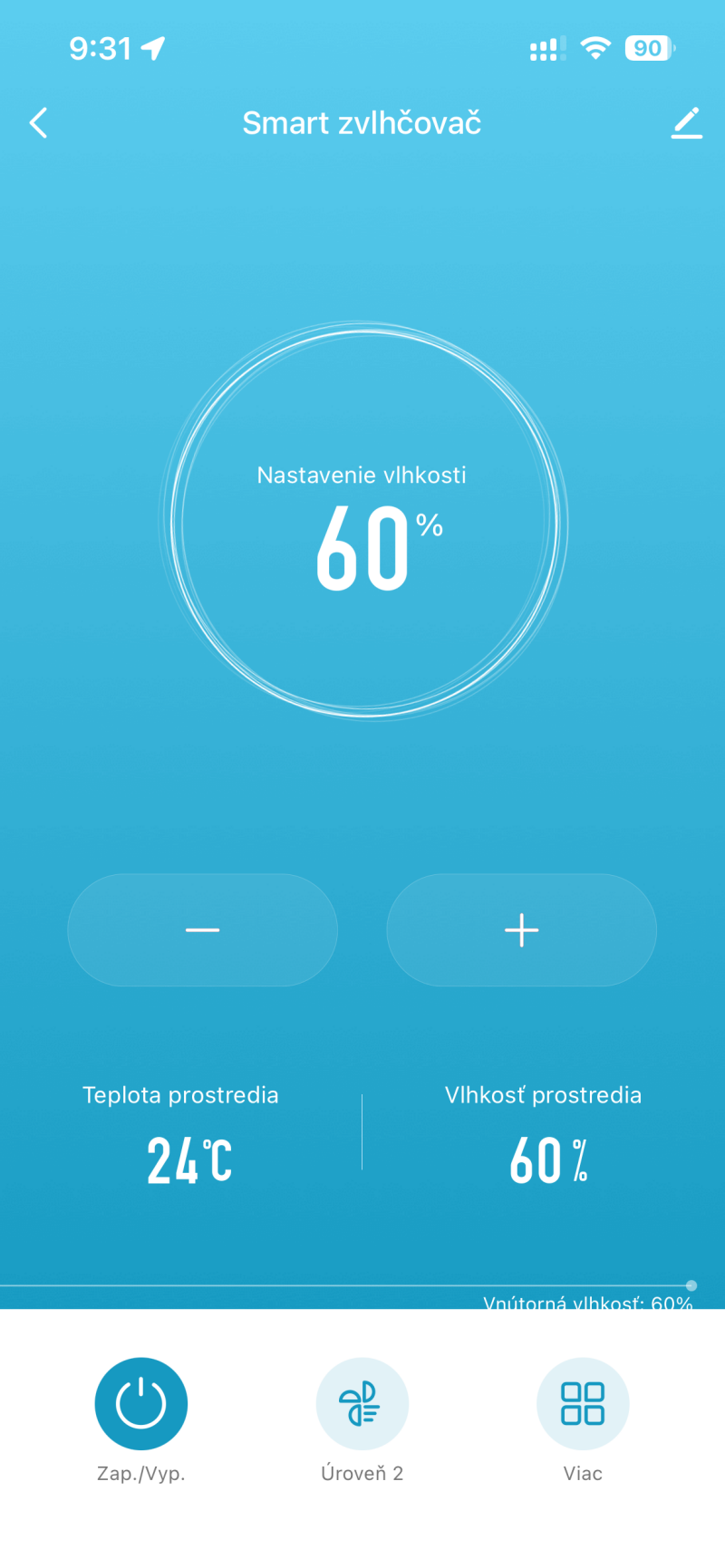 - Pomocou tlačidiel „–“ a „+“ možno jednoducho upraviť požadovanú úroveň vlhkosti.