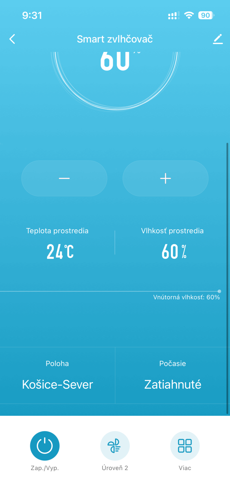 - Spodná časť zobrazuje aktuálnu teplotu (napr. 24 °C) a vlhkosť prostredia (napr. 60 %).