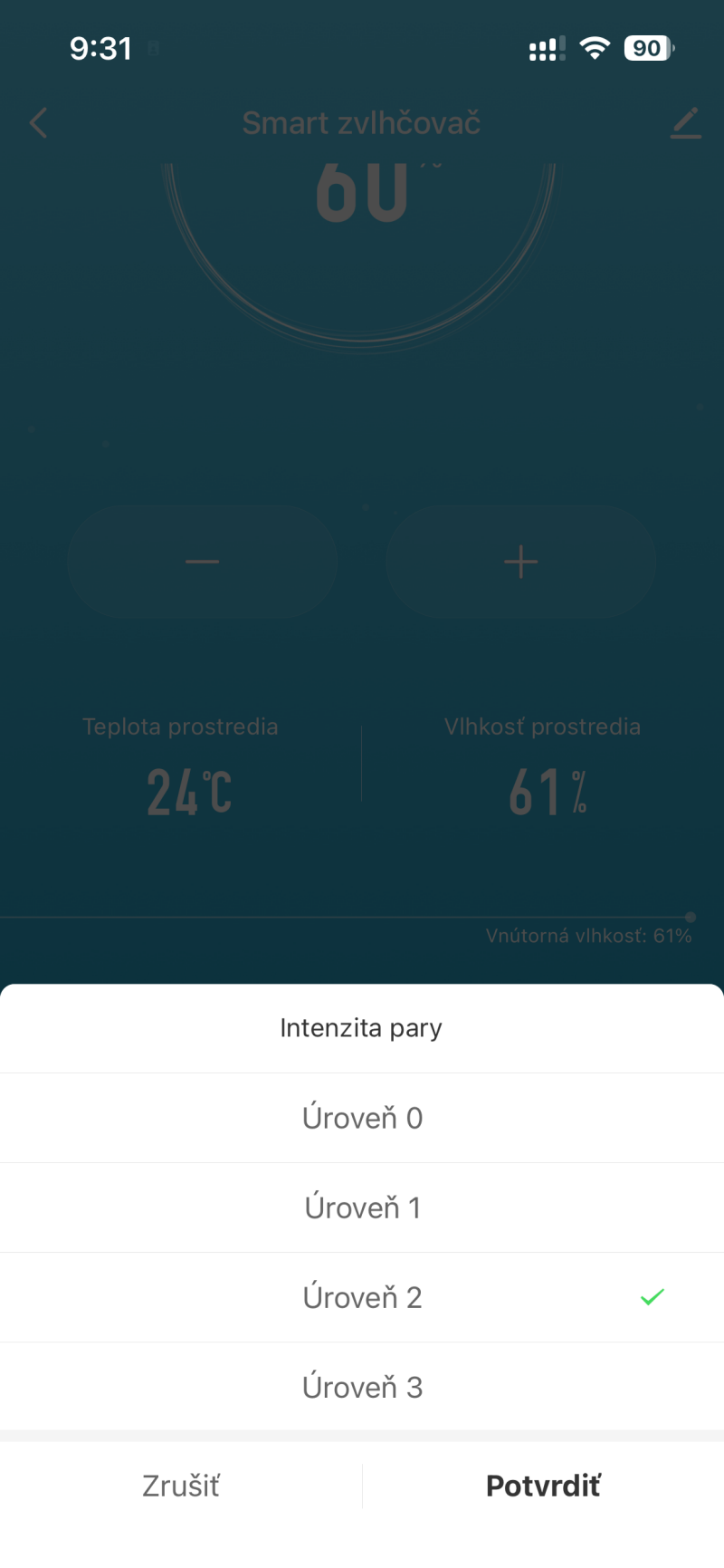 - Vyššia úroveň znamená intenzívnejšie zvlhčovanie a väčší výstup pary.