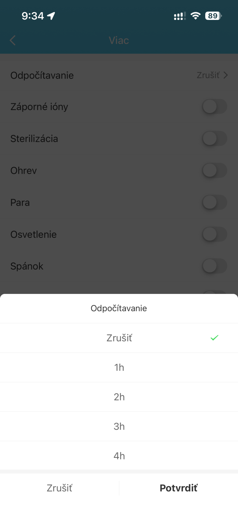 | Časovač | Zrušiť, 1h, 2h, ... , 12h | Nastavenie časovača (odpočítavanie) pre automatické vypnutie. | Nastavím Časovač na "4h" pre vypnutie po 4 hodinách. |