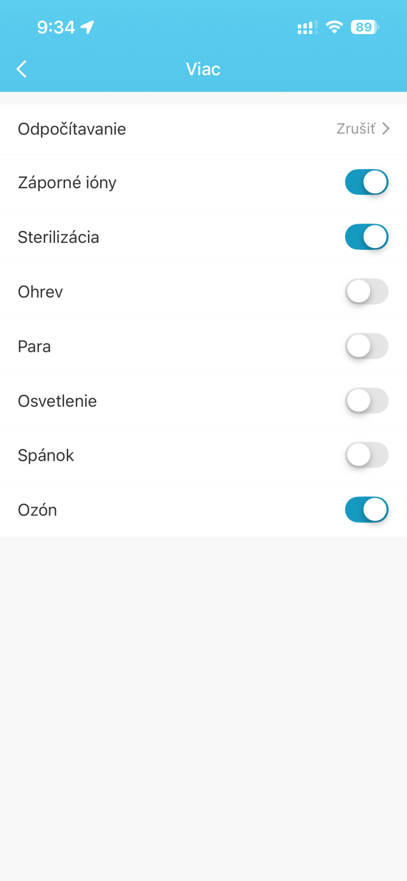 - Každá funkcia má samostatný spínač s vizuálnym indikátorom (modrá farba = zapnuté).
