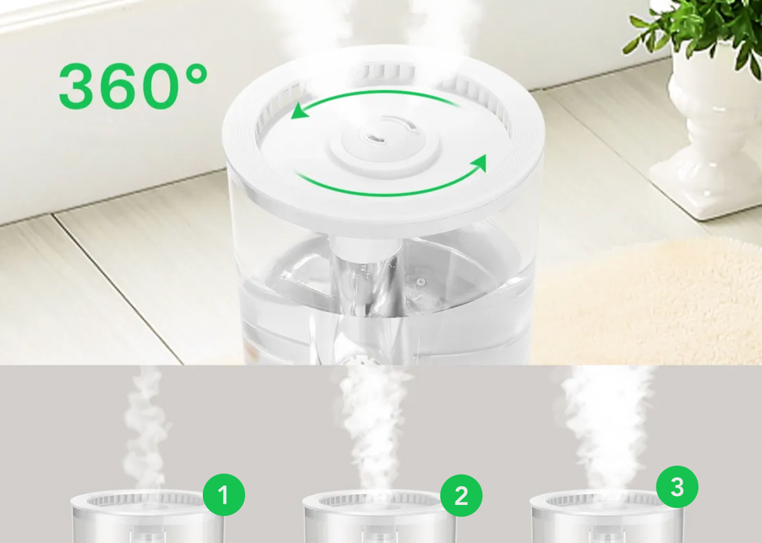 Využíva otáčateľnú výstupnú hlavicu s 360° rozptylom, ktorá zabezpečuje rovnomerné zvlhčovanie vzduchu v celej miestnosti. Para sa rozptyľuje do všetkých smerov, takže sa vlhkosť dostane aj do vzdialenejších častí priestoru - bez tvorby mokrých škvŕn na stenách či nábytku.