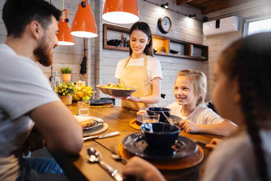 Stlačením predvoleného tlačidla sa spustí scéna "Rodinná večerná pohoda"- aktivuje sa inteligentné tlmené osvetlenie v kuchyni a obývačke, dávkovač krmiva podá porciu nedočkavému psíkovi/mačičke.