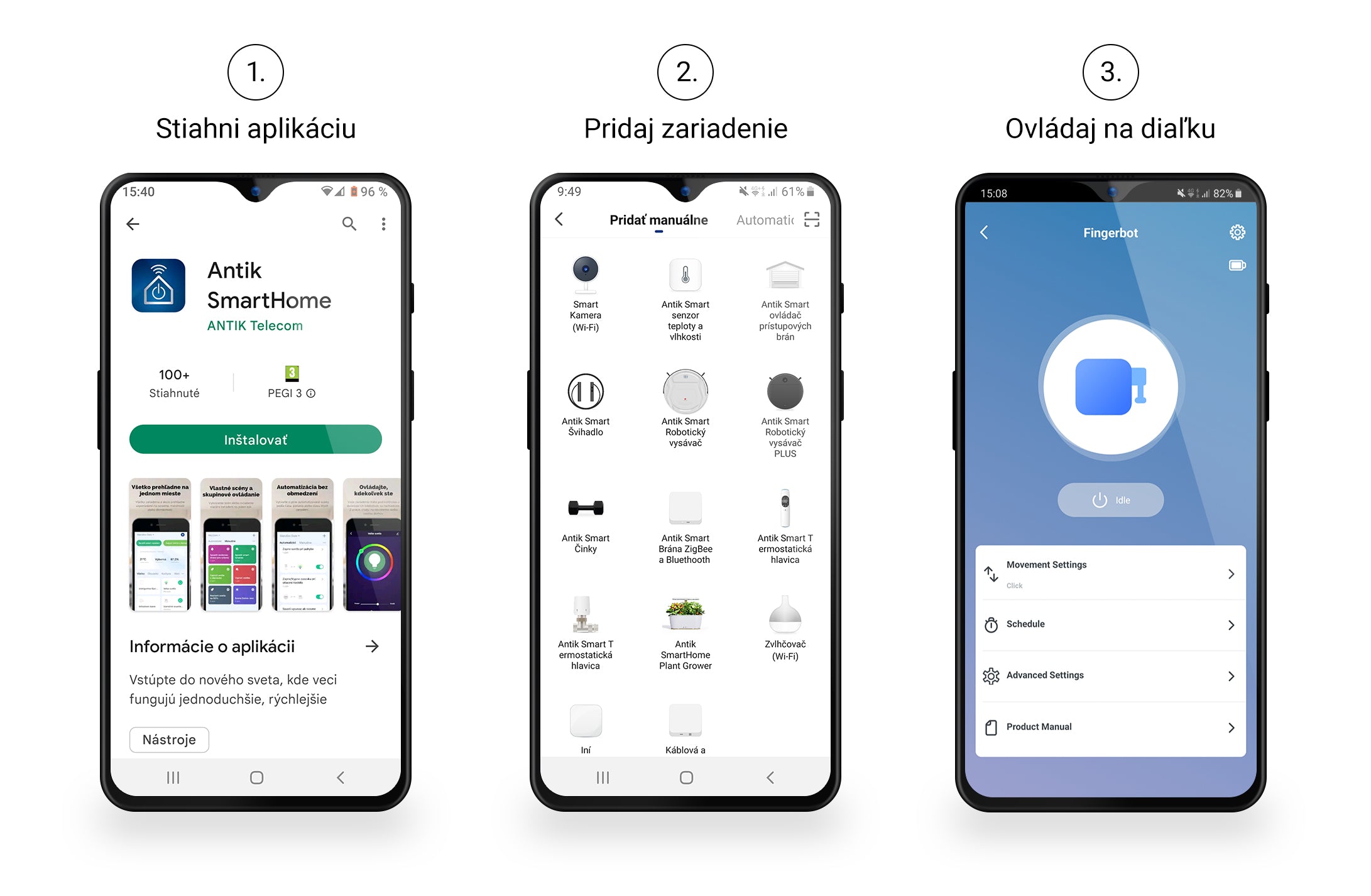 Vyberte režim v aplikácii ANTIK SmartHome a automaticky spustite tlačidlo kedykoľvek budete chcieť. Je kompatibilný s rôznymi tlačidlami a prepínačmi, má jednoduchú inštaláciu a vďaka 3M páske sa môže prilepiť na akýkoľvek povrch.