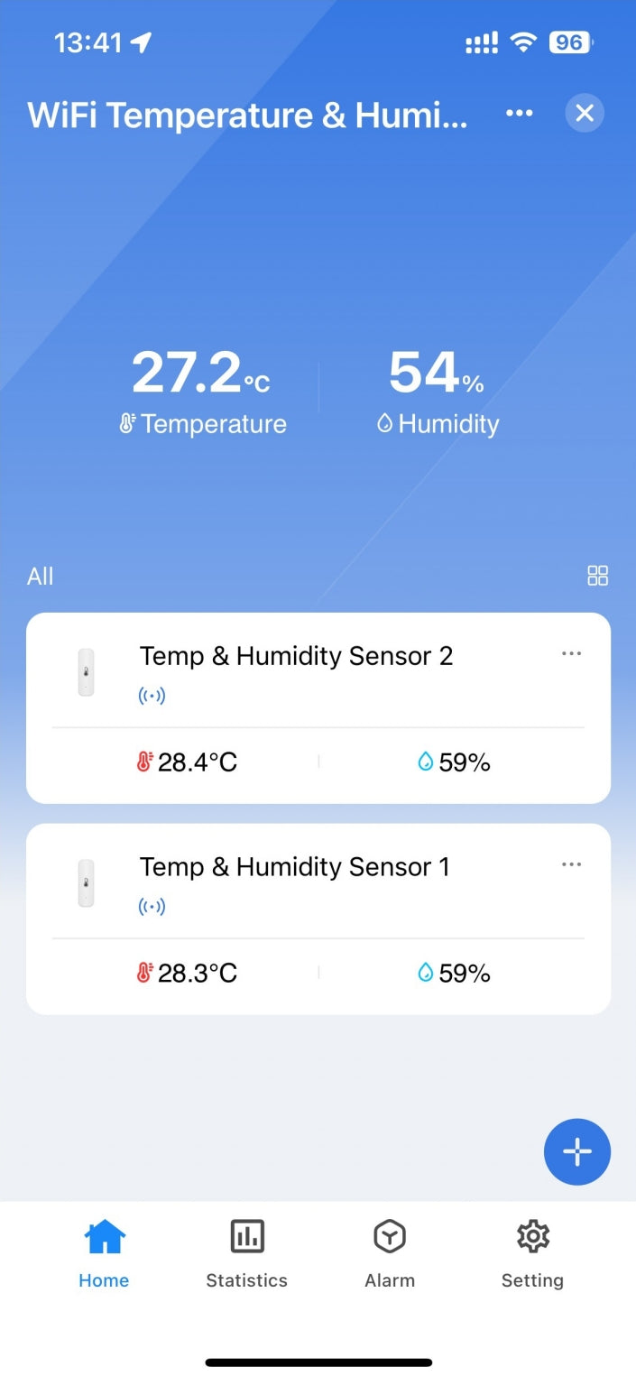 Aplikácia poskytuje čisté a intuitívne rozhranie, v ktorom vidíte hlavné hodnoty aj údaje z jednotlivých senzorov. V sekcii štatistík môžete sledovať dlhodobý vývoj teploty a vlhkosti vo forme prehľadných grafov.