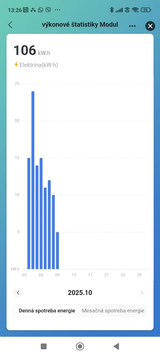 • Graf - stĺpcový diagram dennej spotreby; viditeľné rozdiely medzi dňami (napr. max. stĺpec ~>23 kW·h, neskoršie dni ~5 kW·h).