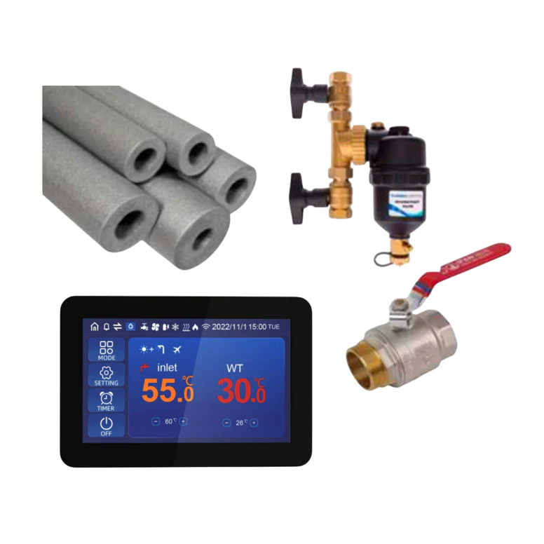 Komplet príslušenstvo potrebné pre montáž a spustenie: vodoinštalačný materiál, magnetický filter, demineralizačný filter, ventily, poistné ventily, automatické odvzdušňovacie ventily, izolácia potrubí, elektroinštalačný materiál