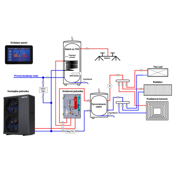 Zabezpečte si efektívne a ekologické vykurovanie s našou zostavou, ktorá obsahuje moderné tepelné čerpadlo vzduch – voda typu monoblok. Tento systém ponúka vysokú účinnosť, nízku hlučnosť a inteligentné riadenie spotreby energií.