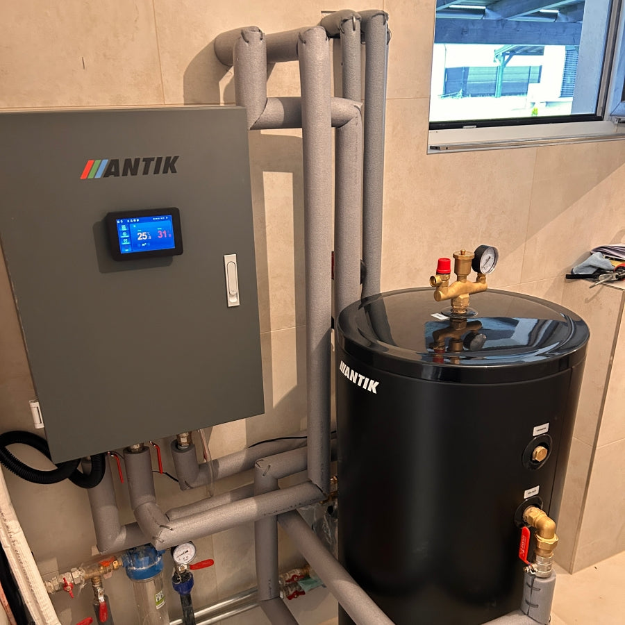 Kompletný systém tepelného čerpadla ANTIK typu monoblok 8 kW s ekologickým chladivom R290 je doplnený o hydraulický rozvádzač s riadiacou elektronikou a akumulačný zásobník teplej vody. Dotykový displej umožňuje detailné nastavenia a monitoring prevádzky, zatiaľ čo kvalitne izolované rozvody znižujú tepelné straty. Zásobník zabezpečuje stabilný prietok a optimálne hospodárenie s energiou pri vykurovaní aj ohreve vody.