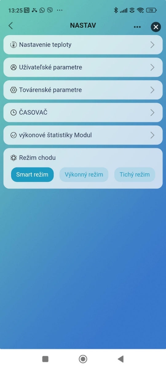 - Režim chodu – voľba medzi Smart, Výkonný a Tichý; momentálne aktívny Smart režim.