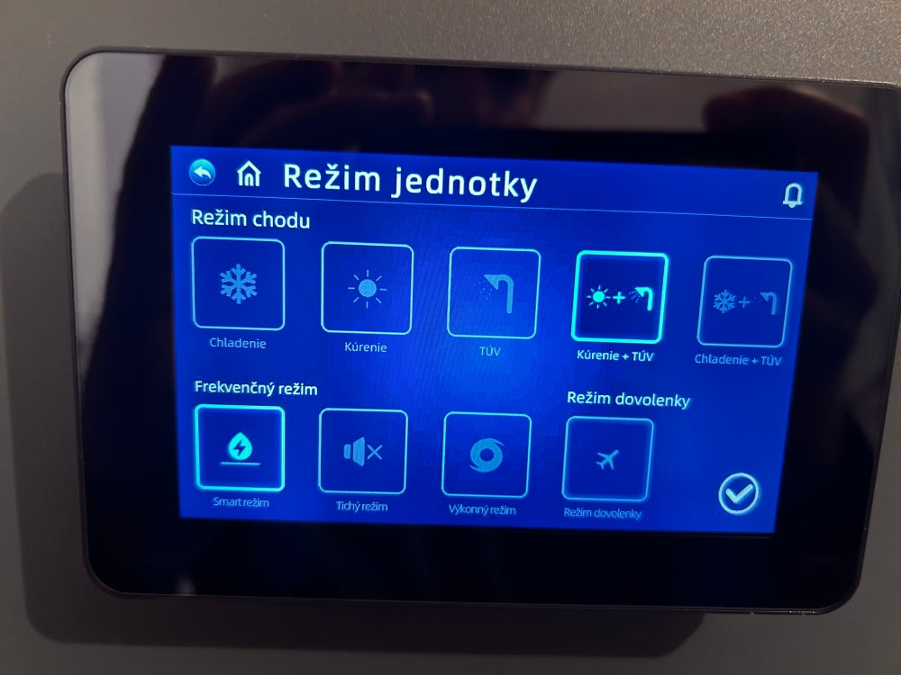 - Režimy prevádzky – vykurovanie, chladenie, TÚV, kombinované režimy aj špeciálny „režim dovolenky“.