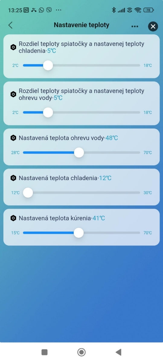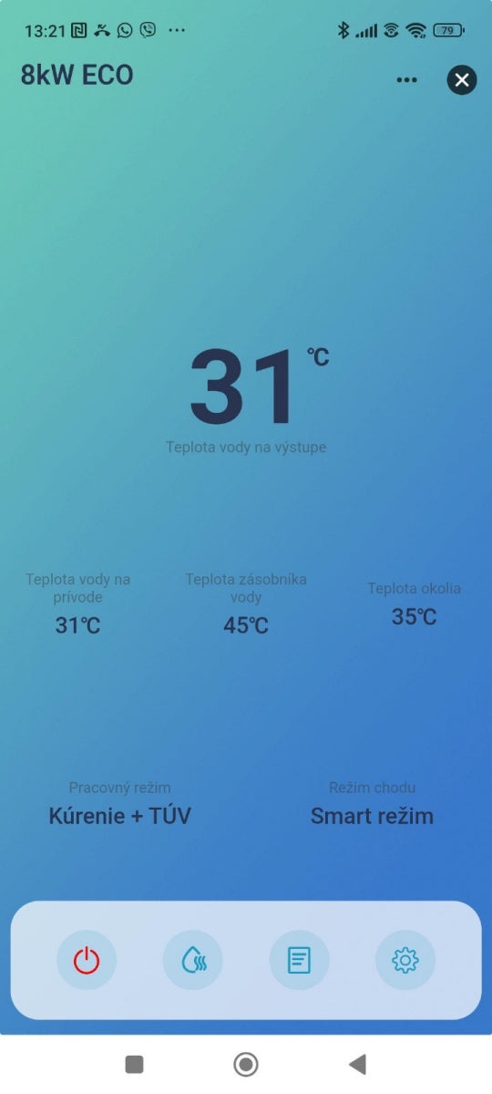 - Nastavenie teploty - otvorí detail s parametrami kúrenia, chladenia a TÚV.