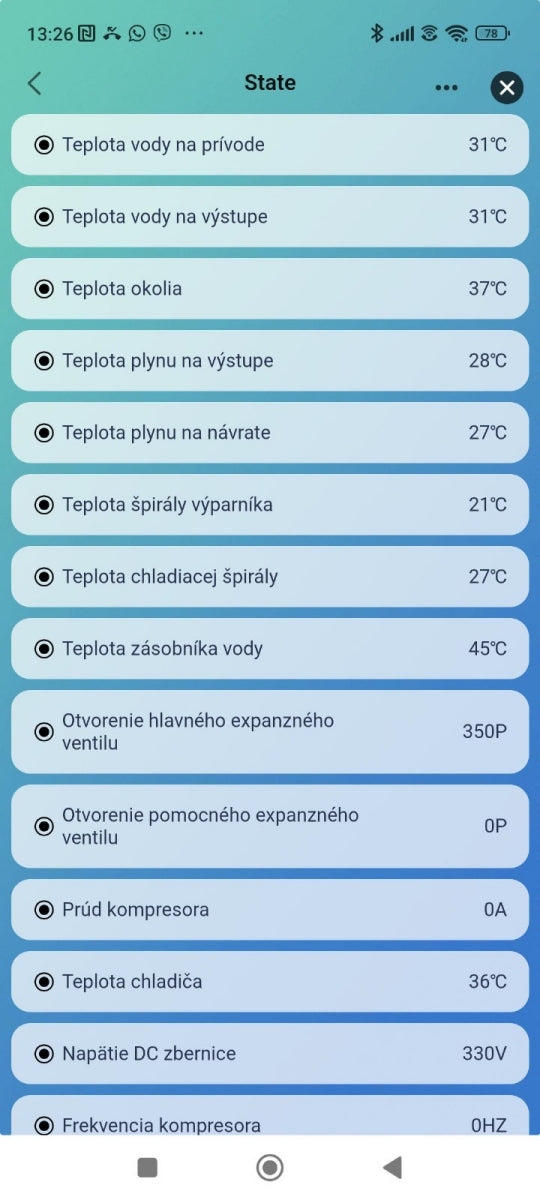 - Doplňujúce hodnoty - teplota na prívode, teplota zásobníka vody, teplota okolia
