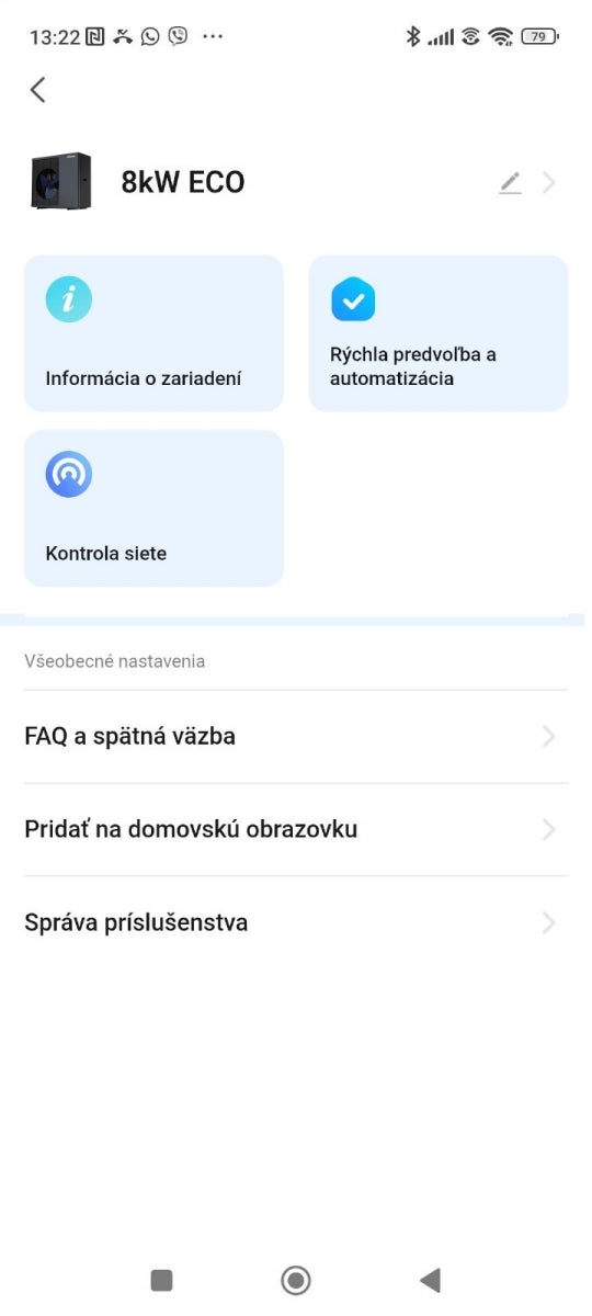 - Všeobecné nastavenia: FAQ a spätná väzba, Pridať na domovskú obrazovku, Správa príslušenstva.