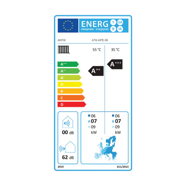 Tepelné čerpadlo ANTIK Monoblok 8kW ECO dosahuje vysokú energetickú efektivitu s triedou A+++ pri teplote vody 35 °C a A++ pri teplote 55 °C, čím zabezpečuje úspornú prevádzku.
