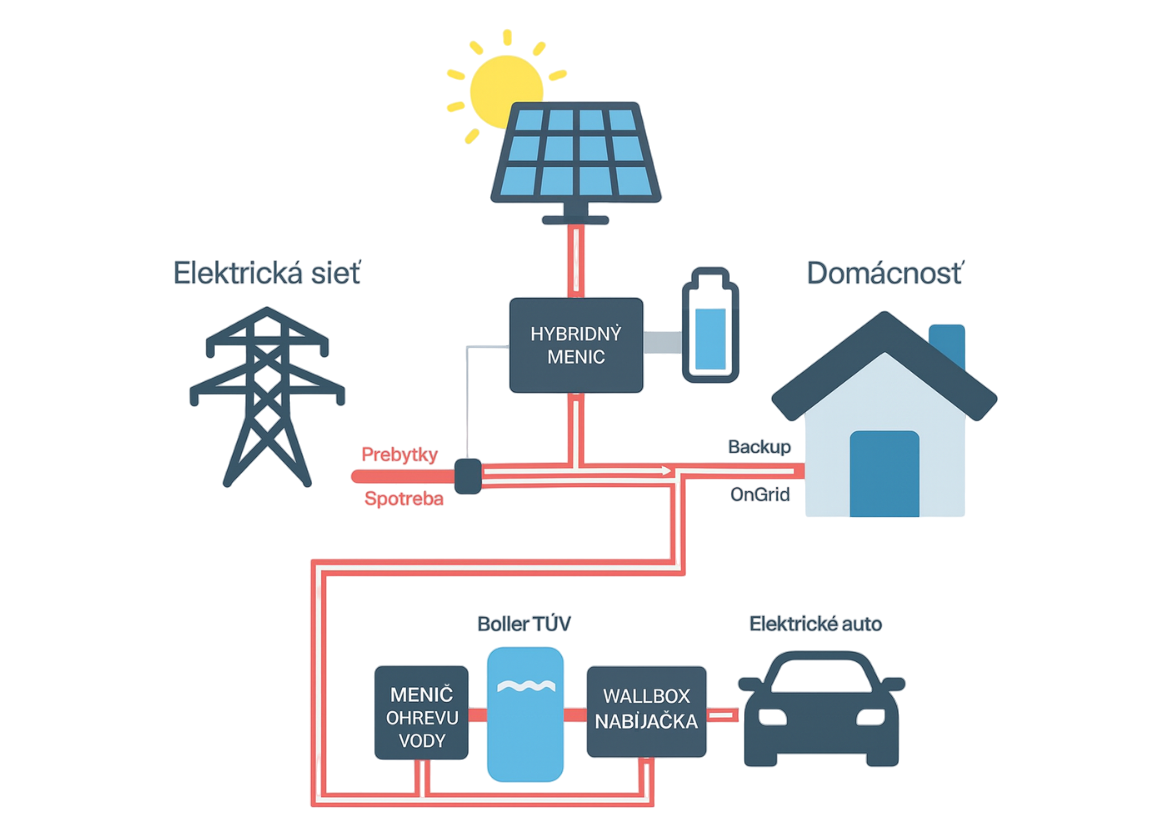 Výhoda: Okrem možnosti akumulovať energiu do batérií, je ďaľšou výhodou hybridného riešenia tzv. ”backup” prevádzka, ktorá Vám umožňuje fungovať na energiu z batériíí aj počas výpadku siete.