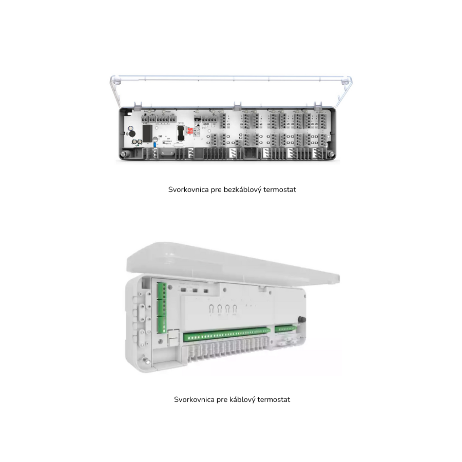 Káblové svorkovnice využívajú kábel na prepojenie s termostatom (dvojlinka). Je však dôležité zdôrazniť, že použitie káblových svorkovníc a dvojlinky vyžaduje plánovanie a zváženie už v počiatočnej fáze prípravy projektu.