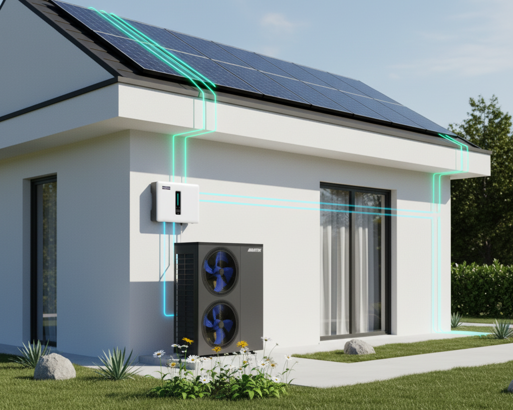 Pomocou hybridného meniča sa systém automaticky prispôsobuje aktuálnej produkcii energie - prednostne využíva solárnu elektrinu a dopĺňa výkon len v prípade potreby. Výsledkom je tichá, ekologická a úsporná prevádzka, ktorá znižuje náklady a zvyšuje komfort bývania.